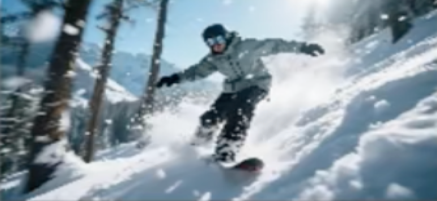 镜头3:斜俯特写,滑雪板冲刺,雪粉飞溅。